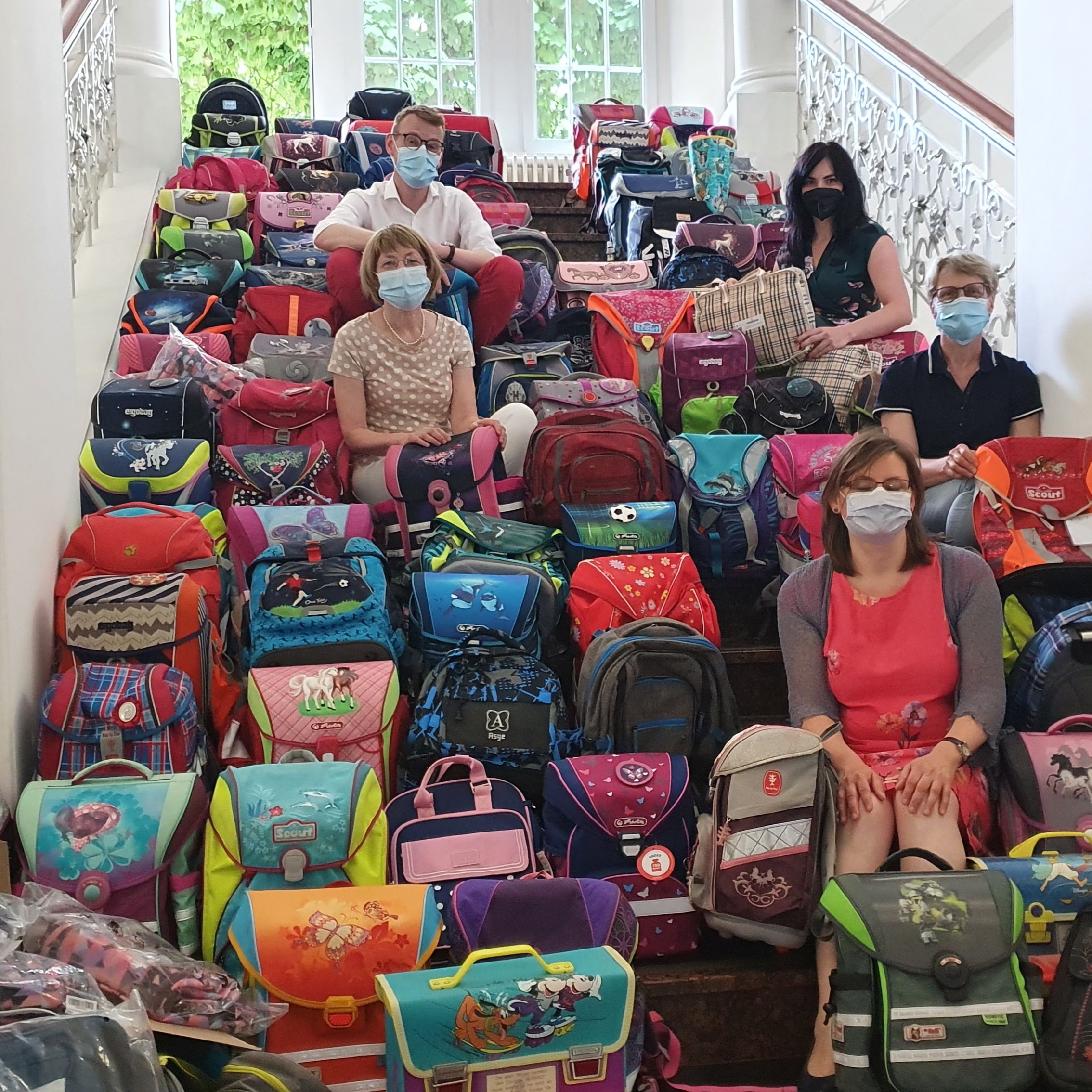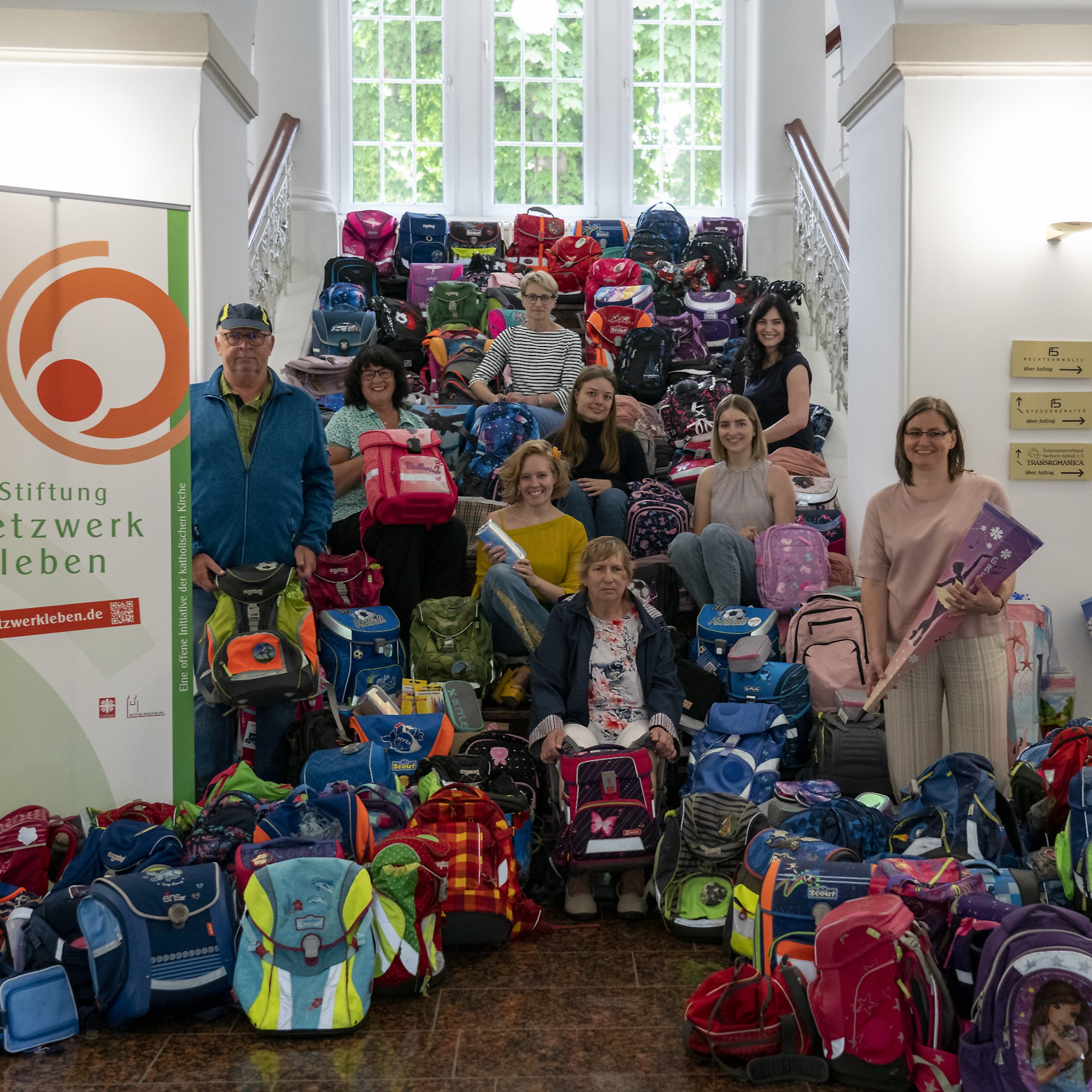 Mit vereinten Kräften wurde es wieder geschafft Die Treppe der Stiftung netzwerkleben wurde erneut mit Ranzen für bedürftige Schülerinnen und Schülern gefüllt.